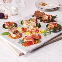 オードブル1段(サーモンとイクラとパプリカのサラダ、エビとパイナップルのセビーチェ、鶏ハムと烏賊のラタトゥイユ仕立てクスクス添え、鴨モモ肉クロケットとキノコのクリーム煮、黒豚のジンジャー煮込み ジャガイモピューレ ブロッコリー添え、パテ・ド・カンパーニュ キャロットラペ)×2