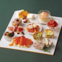 パテ・ド・カンパーニュ、帆立とペンネトマトソース、オリーブ・アンチョビ、サーモントラウトとポテトのサラダ、セミドライトマトのジュレサラダ、海老のカクテル、他5種