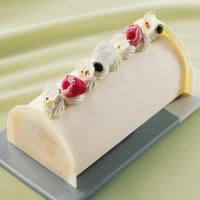 ブランデーを効かせたショコラブランムースの中に、マールドシャンパーニュのババロアや苺のコンポートとフリュイルージュのジュレ。ココナッツのビスキュイとクルスティアンがアクセントのエレガントなビッシュ・ド・ノエルです。