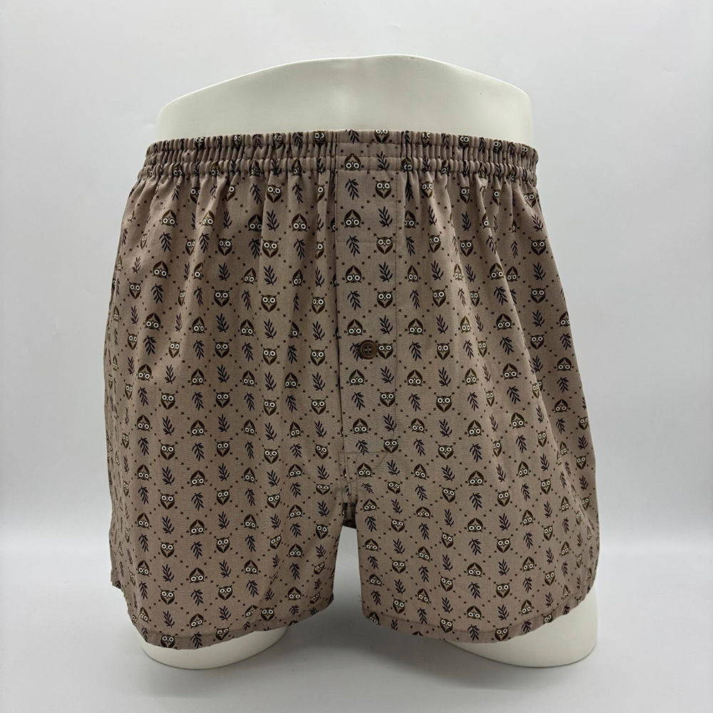 落ち着いたトーンで魅せる、都会的でシンプルなフクロウモチーフ柄トランクス。ウエストは締め付け感が無い2本ゴム仕様でゆったりとした履き心地です。