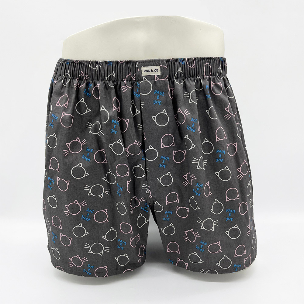 猫をかたどったサークルモチーフを幾何柄風にアレンジした可愛いトランクス。4枚剥ぎのおしりにゆとりを持たせた立体的なパターンを採用。足口スリット入りで余計な突っ張り感を軽減。ショートパンツとしても穿けるファッション性の高いスタイル感。