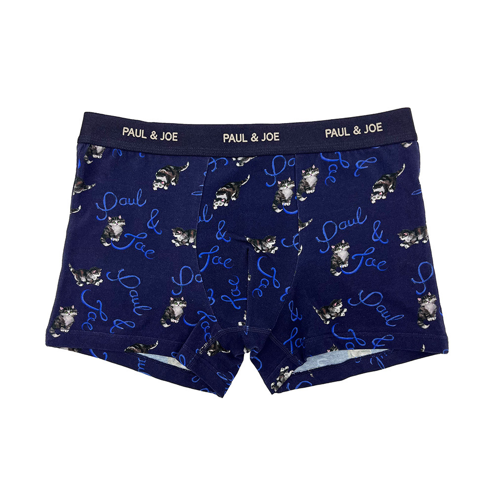 クラシカルなテイストの子猫とロゴ柄ボクサーパンツ。スタイルのフロントは丸みのある立体的なパターンで圧迫感を軽減した前閉じボクサーパンツ。素材はソフトな肌触りとフィット性のある綿ベア天竺素材を採用。ウエストゴムは肌触りの良い裏パイル仕様。