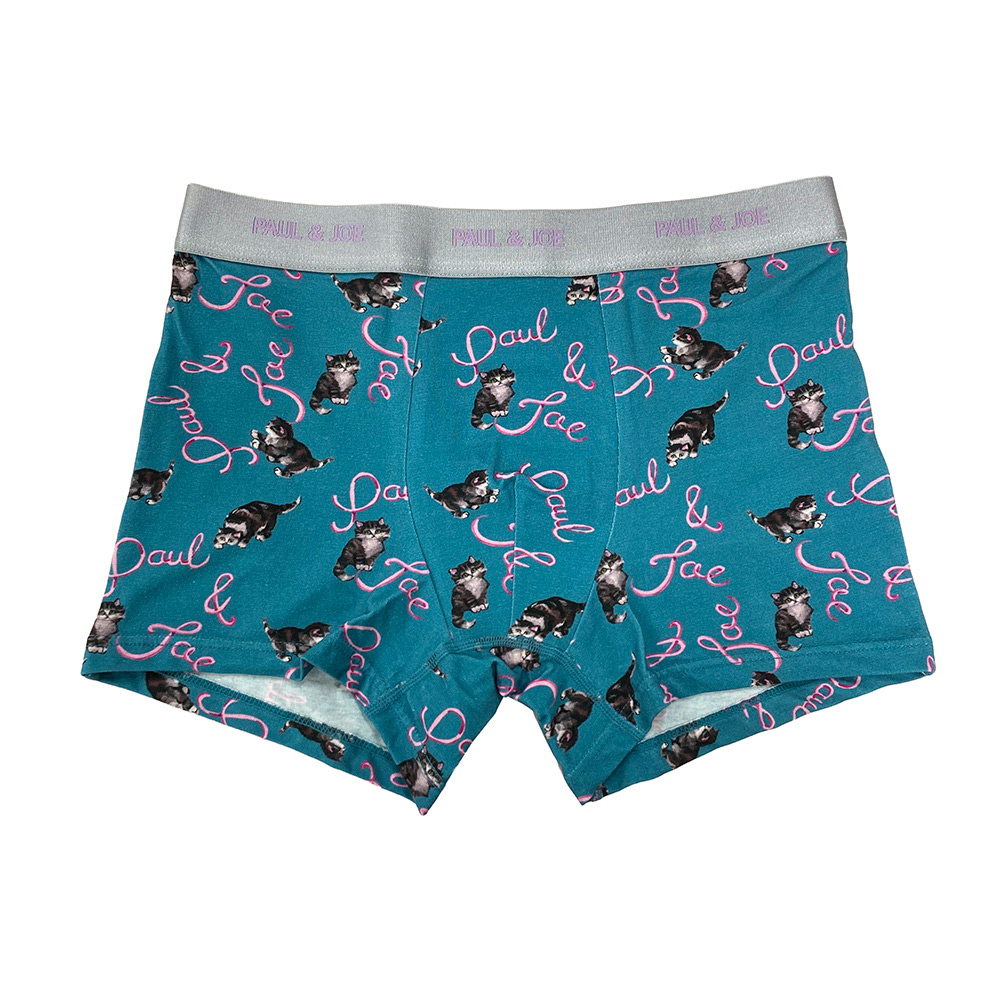 クラシカルなテイストの子猫とロゴ柄ボクサーパンツ。スタイルのフロントは丸みのある立体的なパターンで圧迫感を軽減した前閉じボクサーパンツ。素材はソフトな肌触りとフィット性のある綿ベア天竺素材を採用。ウエストゴムは肌触りの良い裏パイル仕様。