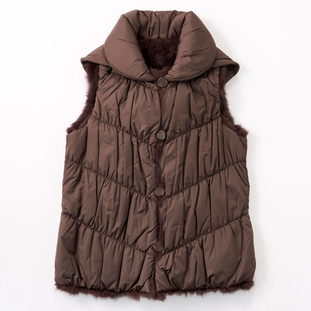 ポリエステルと毛皮(ラビット)をリバーシブルで着用できるベストフードの取り外しもできてインナーとしても活躍します。
