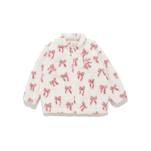 [Fabric]柔らかいフリース素材を使用しています。[Design/Styling]リボン。子どもたちがときめくモチーフをあしらった、ギフトにもおすすめしたいKIDSシリーズです。ふっくら温かな風合いのフリース素材を使用した、お外にも着用していただけるスタンドカラーブルゾン。重ね着しやすいゆとりのあるサイズ感で、胸元にロゴ刺しゅうを添えました。色はリボン柄のピンク。同シリーズのアップリケパンツやワンポイントプルオーバー、小物類を合わせたり、BABYサイズとのリンク・コーディネートもお楽しみいただけます。