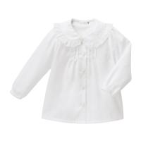 大きめの襟には、さりげないロゴ刺しゅうがほどこされ、蝶リボンの刺しゅうが入ったフリルが付いて、清楚でかわいらしい印象に。前身頃にはピンタックのデザインをいれて、上品に仕立てました。形態安定加工の液体アンモニア加工も施しており、強度、防縮性、防シワ性を向上し、洗濯を繰り返しても形態が安定するのもポイントです。