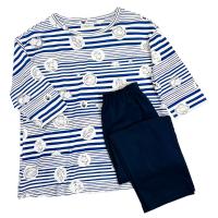 マリン調のボーダー柄にムーミンとリトルミイを配したカジュアルなルームウェアです。ボートネックの7分袖のトップスに8分ズボンを合わせたデザインです。