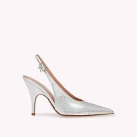 メタリックレザーから丹念に作り上げたスリングバックパンプス、Sofia Sling。高さ95mmのヒールと水ヘビをイメージしたデザインが特徴です。ハンドメイドで仕上げました。