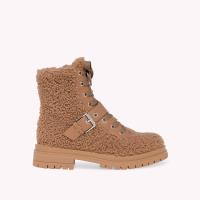 レザーとシアリングで作り上げたラウンドトゥのブーティ、Chamonix。ラバー素材のソールは、前側の高さが25mm、かかと側の高さが40mm。メタルアイレットと、トーン・オン・トーンのシューレースがあしらわれ、内側にジッパーが付いています。ハンドメイドで仕上げました。