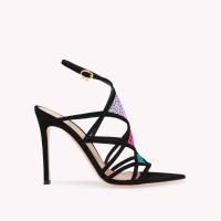 スエードとメッシュ素材で丹念に作り上げたポインテッドトゥサンダル、Confetti。高さ105mmのスティレットヒールを備え、クロスモチーフを描くように施したスエードのトリムは、煌びやかなクリスタルで装飾されています。ハンドメイドで仕上げました。