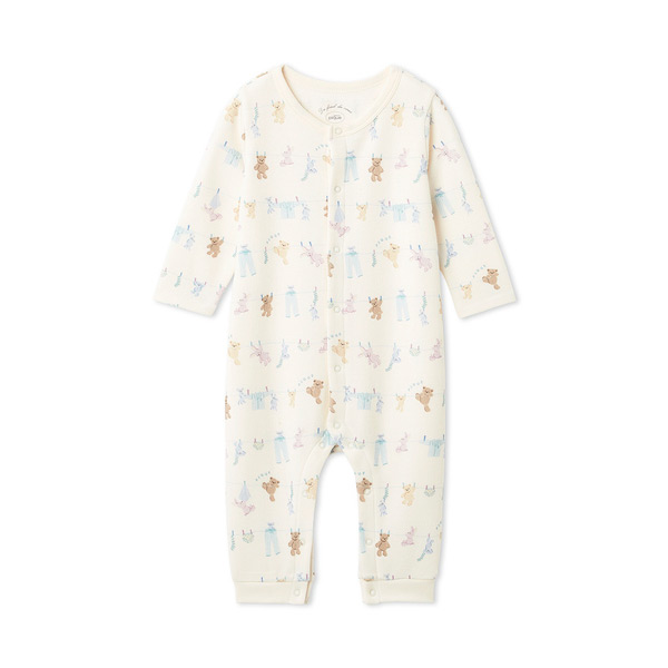 [Fabric]適度な厚みと柔らかさのあるエイトロックのカットソ-素材を使用しました。[Design/Styling]シャボンの香りが漂ってきそうな、春のピースフルなお洗濯タイム。ウォッシングアニマルシリーズです。洗濯紐に留まったルームウェアやぬいぐるみたちの絵柄を、総柄プリントしたキュートなBABYロンパース。ぐるりと入った絵柄の中には、ロープをよじのぼろうとする愛らしいベアも混ざっています。寒さが続く今の時期にちょうど良い、ふんわりとした肌触りのエイトロック素材を使用。肌寒いときには羽織りをプラスするのもおすすめです。色は春らしい爽やかな色合いのオフホワイトとブルーを揃えました。同シリーズのジャガードポンチョや雑貨と合わせてギフトにしたり、KIDSサイズとのリンク・コーディネートもお楽しみいただけます。