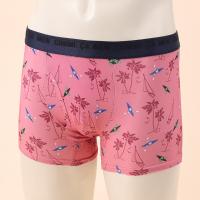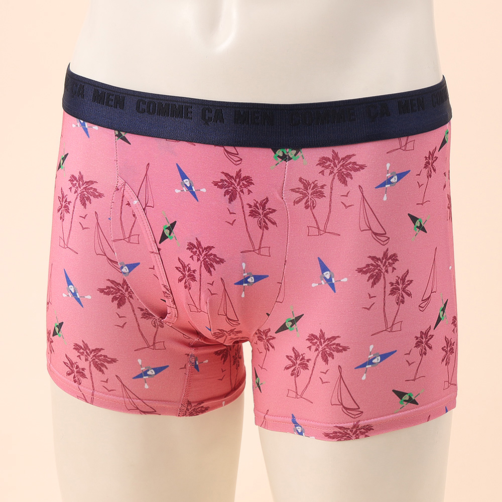 カヌーを漕ぐモチーフを散りばめた遊び心ある総柄ボクサーパンツ。レギュラー丈、ウエストゴムは肌触りの良い裏パイル仕様、前開きタイプ。