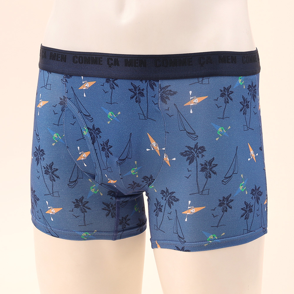 カヌーを漕ぐモチーフを散りばめた遊び心ある総柄ボクサーパンツ。レギュラー丈、ウエストゴムは肌触りの良い裏パイル仕様、前開きタイプ。