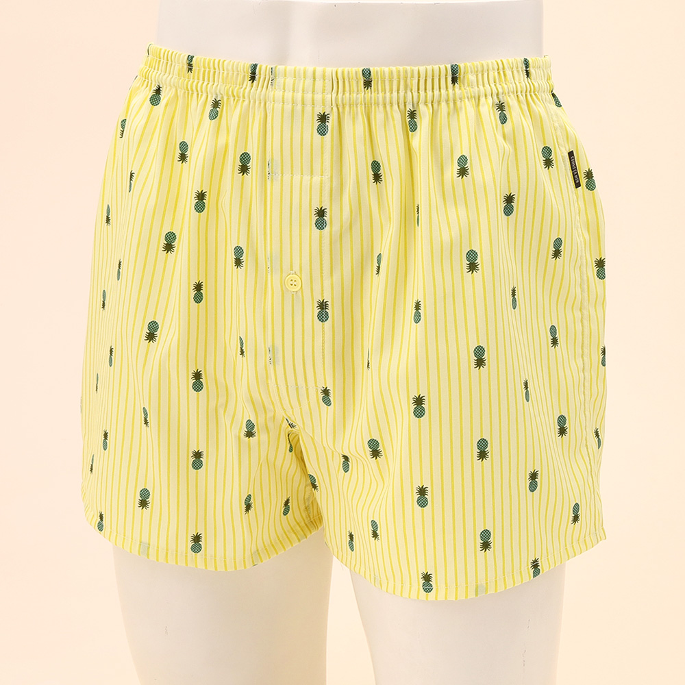 爽やかなデザインが魅力のパイナップル柄トランクス。ウエストは締め付け感が無い2本ゴム仕様でゆったりとした履き心地です。綿100%