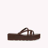 レザーから丹念に作り上げたラウンドトゥのトングサンダル、Nadina Thong。アシンメトリーなデザインのアッパーが目を引く一足です。フラットなプラットフォームソールの厚さは、前側が40mm、後ろ側が45mm。手作業によって仕上げました。