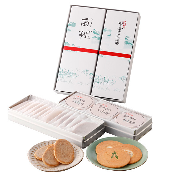 京野菜をうすく入れた煎餅と麩焼きに淡い甘辛と黒砂糖の蜜を刷いたお煎餅の詰め合わせです。