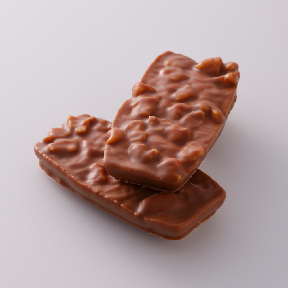 “舟”という意味の“Bateau”。サブレ生地の上にマカデミアナッツをのせて焼き上げ、ミルクチョコレートで包んだクッキーです。