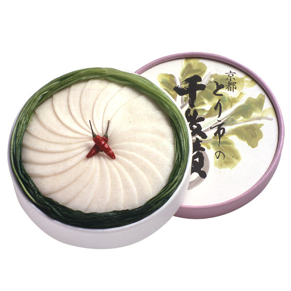 千枚漬は京漬物の代表格として知られ、厳選した丹後産の聖護院かぶらを一枚一枚薄くスライスしたものに、北海道産の上質の昆布を贅沢に使って本漬しています。昆布のうまみとまったりとしたまろやかな風味は、とり市伝統の手づくりの味として受け継がれています。