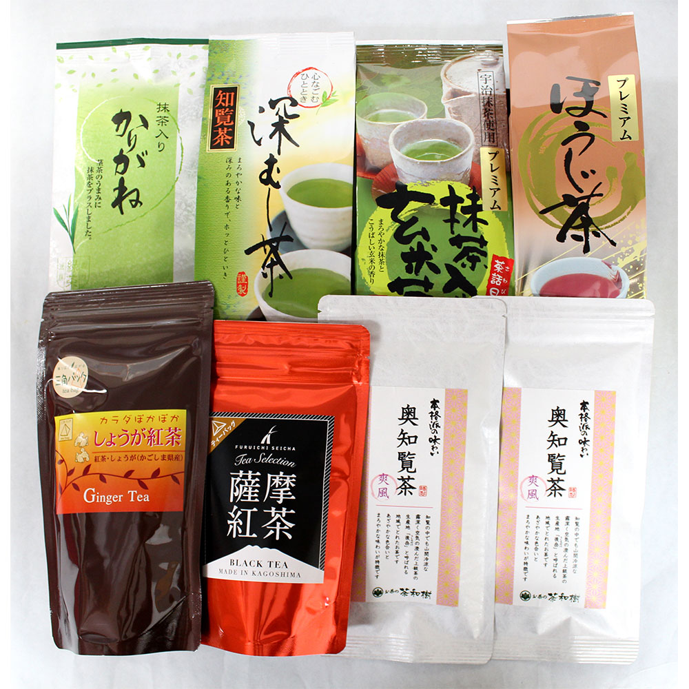 深むし知覧茶200g×1、奥知覧茶爽風100g×2、抹茶かりがね100g×1、プレミアム抹茶玄米茶150g×1、プレミアムほうじ茶100g×1、しょうが紅茶(3g×15パック入り)×1、薩摩紅茶(3g×12パック入り)×1