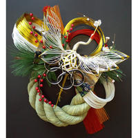 ボリューム感のあるしめ縄と鶴を配したお飾りです。縁起の良い松や南天をあしらいました。