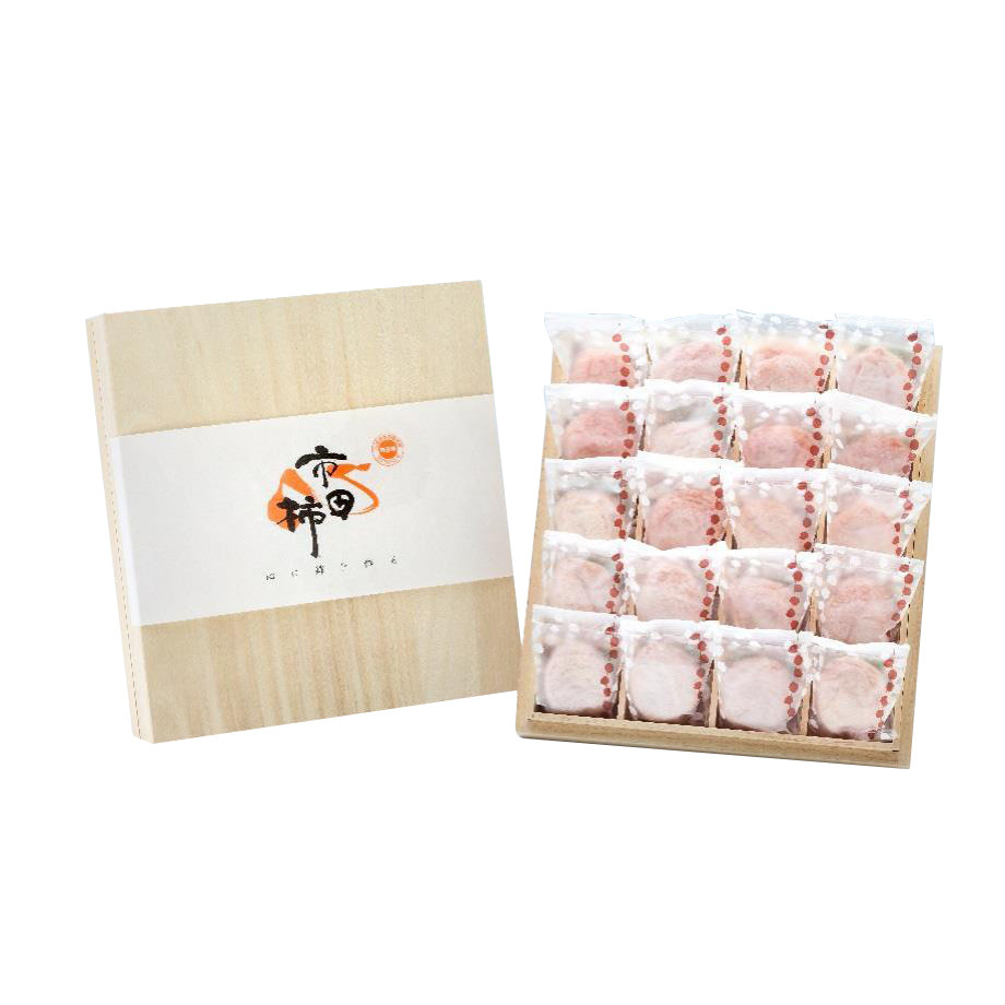 市田柿の生産は柿の栽培・収穫・皮むき・乾燥だけではなく、乾燥過程で柿を一粒一粒揉み、乾燥を繰り返し行うことで柿の糖分が表面に結晶化しもっちりとした食感と上品な甘さに仕上がります。一粒34g以上の大粒サイズをご進物におすすめの桐箱につめてお届けします。