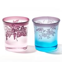 彫刻夢柄子は、二層の色被せ硝子を一つ一つ手吹きにて作り、その器にサンドブラストの技法を使って彫刻を手作業でほどこし、二色のコントラストで図柄を表現しています。