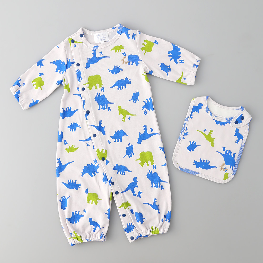 シルエットで表現した恐竜プリントが、キュートに映える2WAYオール。肌あたりやさしい綿100%素材だから、ベビーにも安心。お揃いのスタイをセットしました。ご出産のお祝いにおすすめです。※画像と柄の位置が異なる場合がございます、ご了承ください。