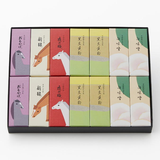 [京都限定小形羊羹]白味噌・黒豆黄粉 各4、[干支パッケージ小形羊羹]夜の梅・おもかげ・新緑 各2