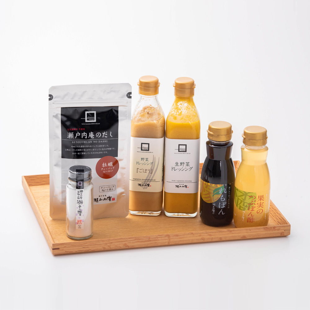 倉敷・美観地区にある瀬戸内庵から、「素材そのものの味を、いかにそのままに、最高の塩梅(あんばい)で味わうか」をテーマに、瀬戸内の食文化を伝えるだしやドレッシングの詰め合わせです。