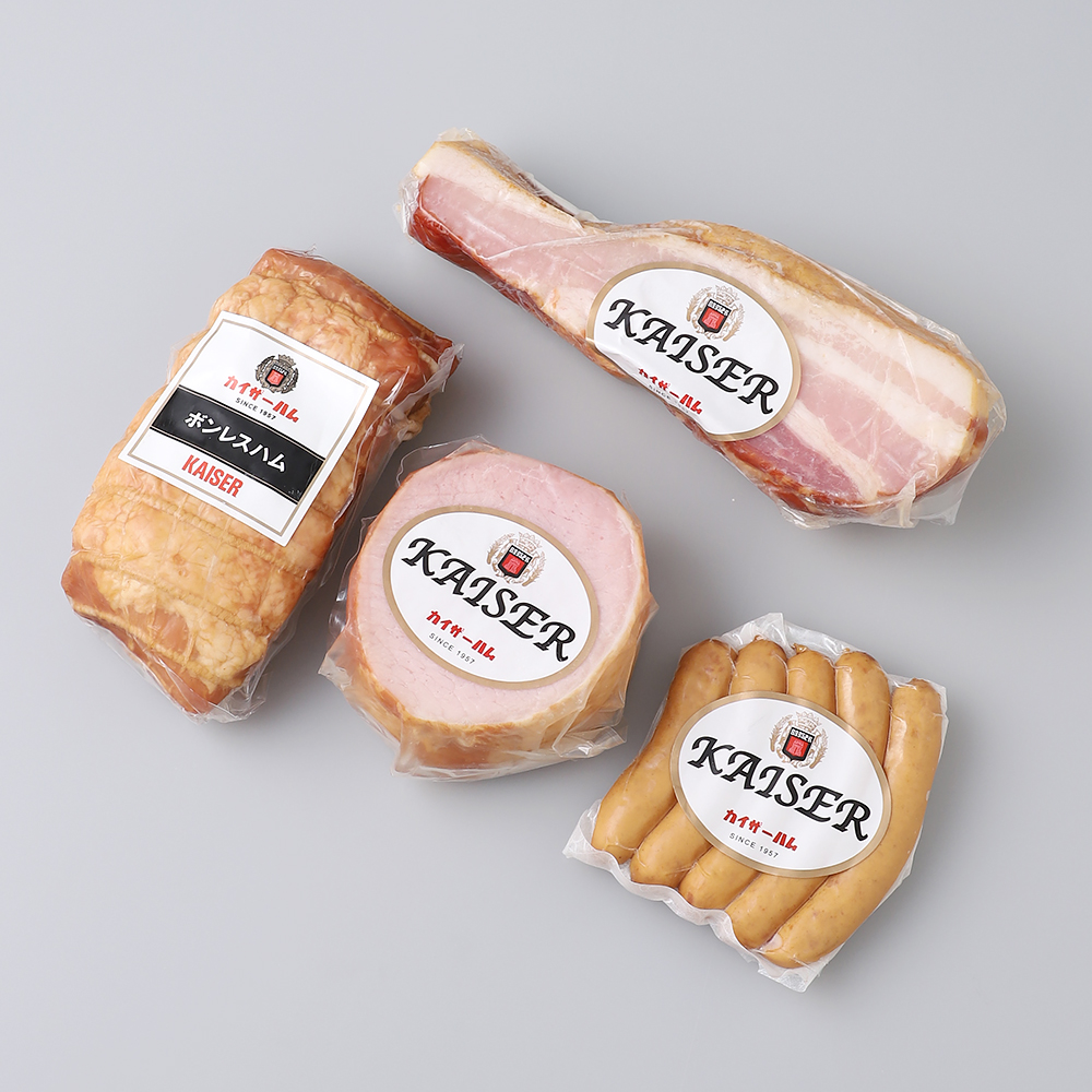 カイザーハムの人気商品をお買得に詰め合わせました。ロースハム、ボンレスハム、ベーコン、ウインナーと、バラエティー豊かな詰め合わせになっております。