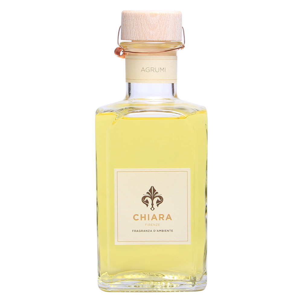 イタリアのトスカーナ州フィレンツェで生まれた「キアラフィレンツェ」。自然豊かなトスカーナ地方の天然原料にこだわり、厳選された上質な天然香料と穀物などから精製されたバイオエタノールを豊富に用いて、一つ一つ丁寧な手仕事により仕上げられています。「アグルミ」 搾りたてのジューシーなシトラスエッセンスからうまれた心躍りだすイタリアンフルーティーノート。トップ:グレープフルーツ。ミドル:ベルガモット、スウィートオレンジ。ベース:レモンピール。