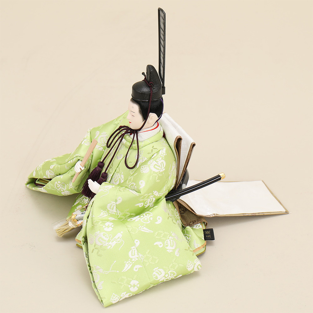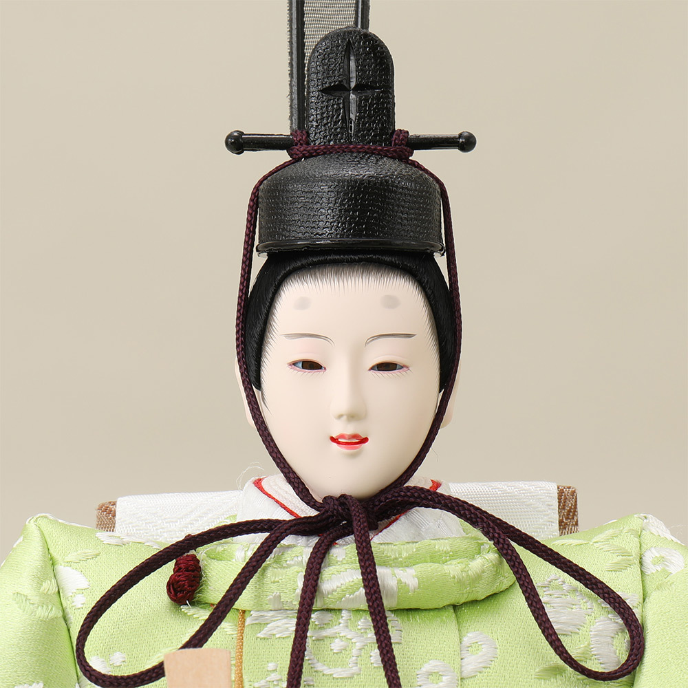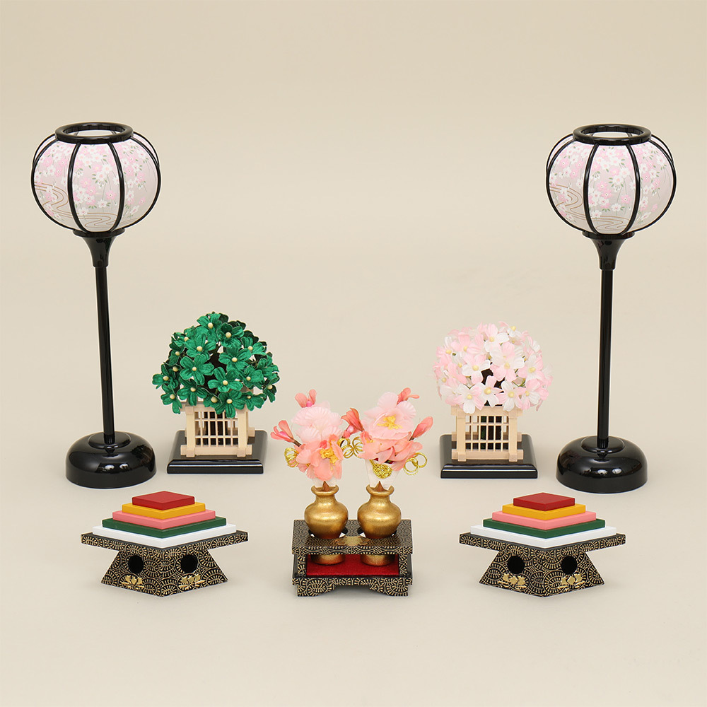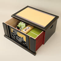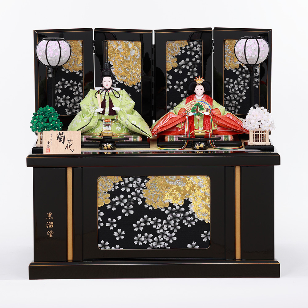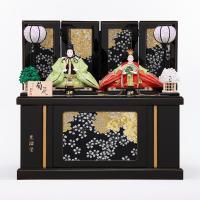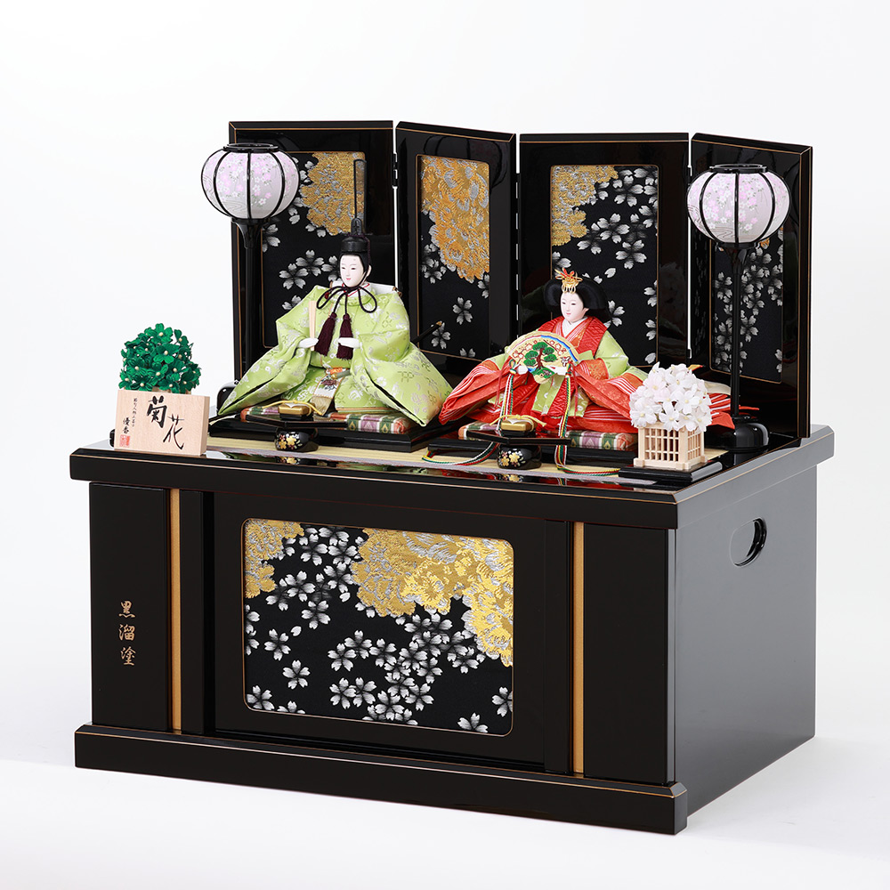 飾り台の中に一式しまえる、コンパクトな親王飾り。黒溜塗りの飾り台には、人形・道具などがしまえる親王飾りです。飾り台は引きだしタイプになっています。