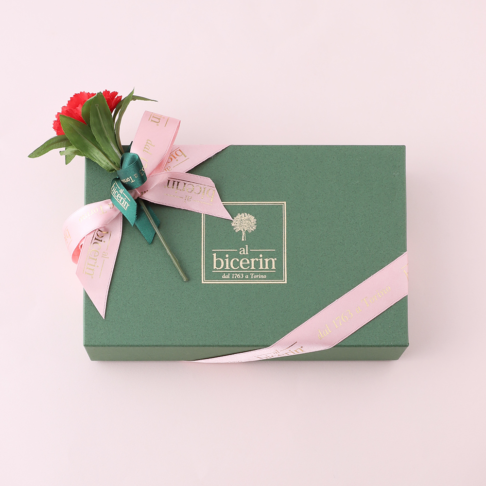 バーチ・ディ・ダーマ15個入(エスプレッソ×5個・プレーン×5個・抹茶×5個)、カーネーション(造花)×1、ビチェリン専用手提げ×1