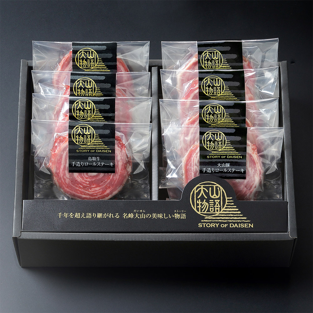 鳥取牛手造りロールステーキ80g×4、大山豚手造りロールステーキ80g×4(成型肉)