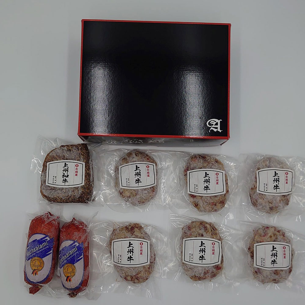 上州和牛モモ肉のローストビーフ300g、上州牛ハンバーグ90g×6、コッホサラミ250g×2