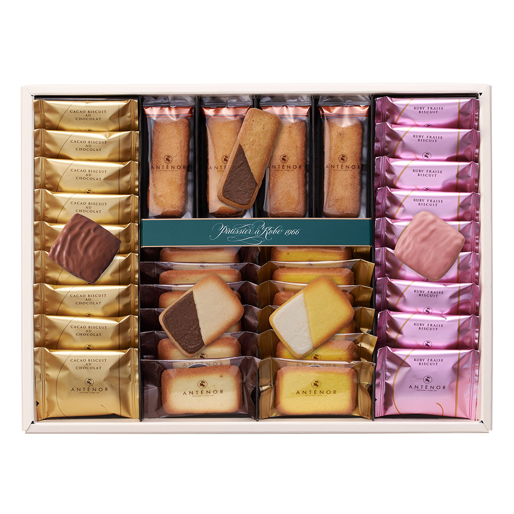 ラングドシャ・ショコラ×6個、ラングドシャ・シトロン×6個、ビスキュイ・オ・ショコラ×8個、カカオビスキュイ・オ・ショコラ×9個、ルビーフレーズ・ビスキュイ×9個 計38個