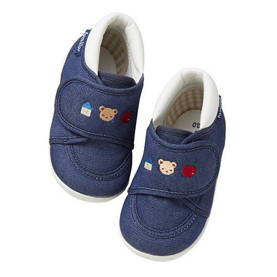 デニム素材でどんなお洋服にも合わせやすいく、履き口部分が大きいので、甲高でも履かせやすい。足首部分にパットが入っており、やさしく足を支えてくれるため、歩き始めのお子様におすすめです。