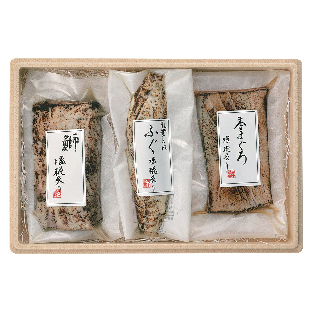 塩糀に漬けこんで旨みを引き出した後に高温の炎で炙って仕上げました。鰤、本まぐろ、ふぐの三種のお詰め合わせです。