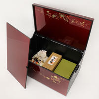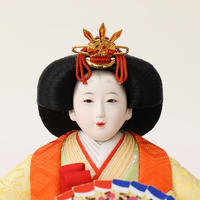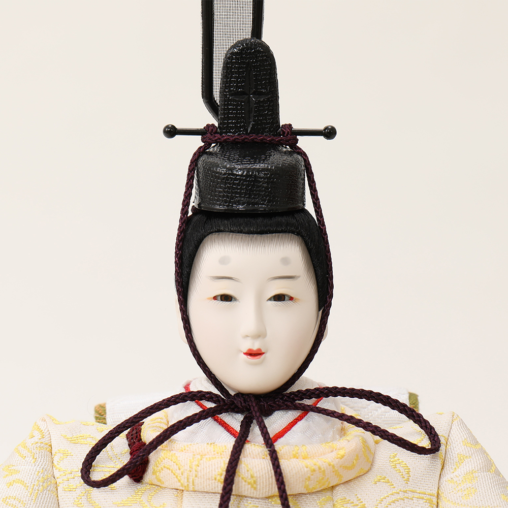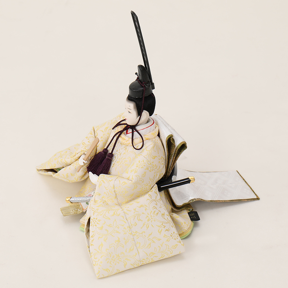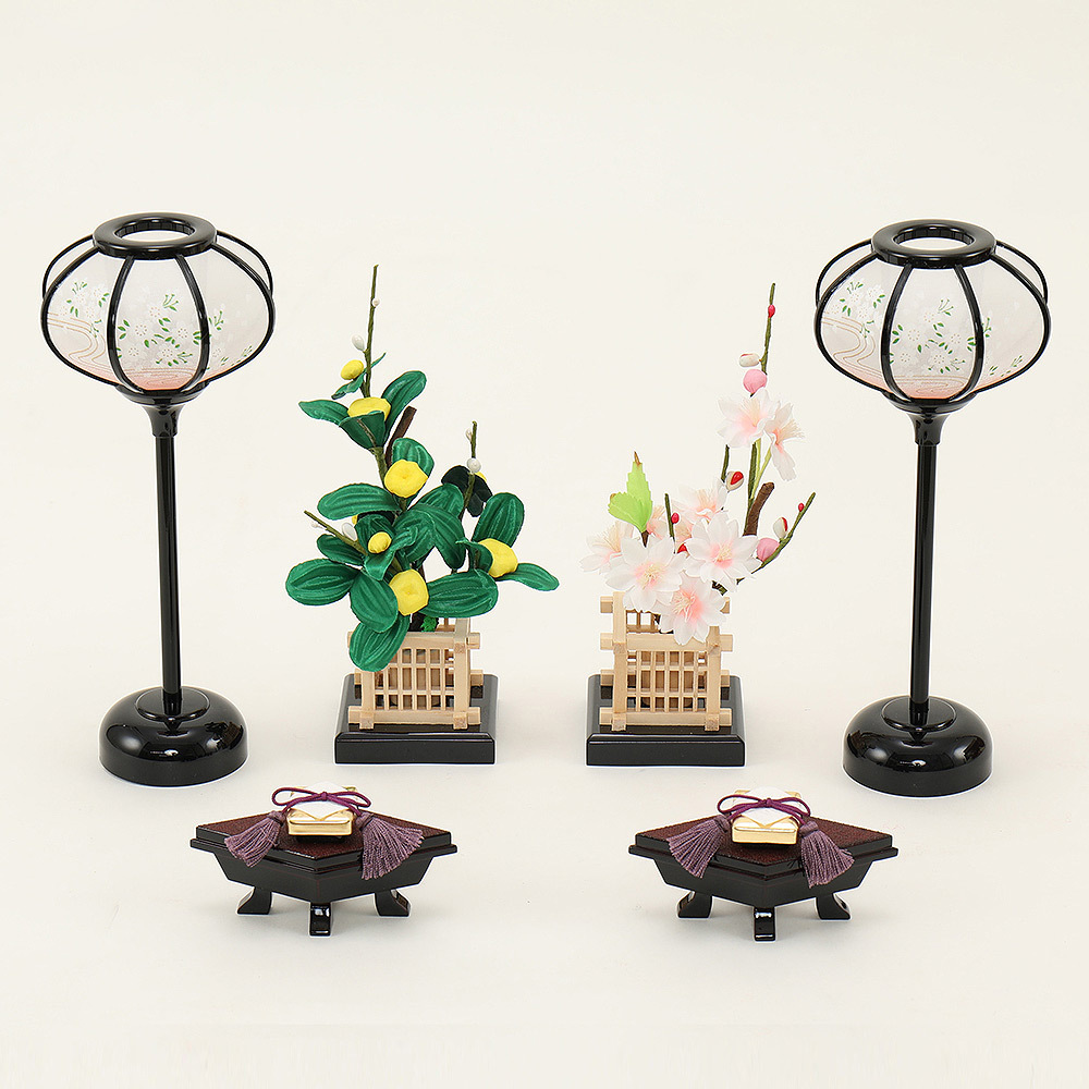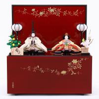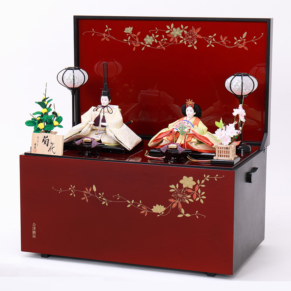 飾り台の中に一式しまえる、コンパクトな親王飾り。会津塗で仕上げた飾り台には、「美しい心」の花言葉を持つ鉄せんの柄が描かれています。上品な雰囲気の親王飾りです。