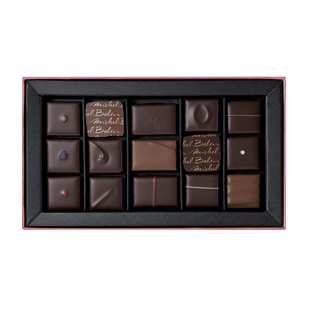 ベネズエラ産やエクアドル産カカオのショコラ、華やかな味わいの苺やカシス、フランボワーズのショコラ、アーモンドとレモンや、シナモンとキャラメルなどベテラン職人の技が光る芳醇な味わいのショコラ15種類を詰め合わせました。