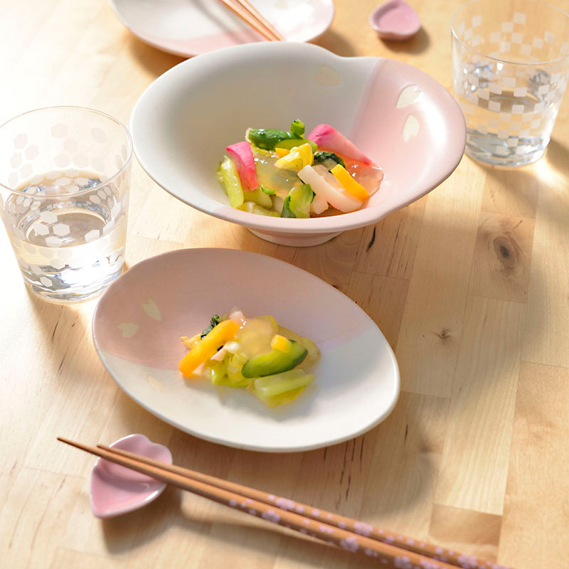 淡く霞む古都を思わせる、やわらかな春色の揃え。桜の花びらのようなハートを象った器がキュートです。さらにワンポイントの桜模様が料理に品よく寄り添います。普段使いはもちろん、春にだけ使うとっておきの器というのも素敵です。
