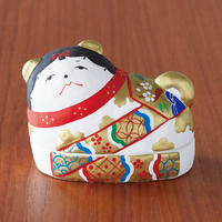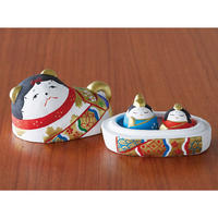 やきものの町、愛知県瀬戸市にある工房「玩具工房」は、瀬戸で培われてきたノベルティの技術を用い、新たな郷土玩具を提案しています。玩具工房のお雛様は、どれもモダンでかわいらしい姿。「大切な想いを、もっと身近で親しみやすいかたちにしたい。」という願いのこもったお雛様です。今の暮らしのインテリアスタイルにあわせて、玩具工房の彩り豊かな愛らしいお雛様を飾ることで、家族の時間がより大切なものに感じられそうです。犬筥に小さな男雛と女雛が入ったこのタイプは、安産や子供の健康を祈る犬筥とともに、新しい家族の誕生を待ちわびているようです。それぞれに丁寧に描かれた模様も素敵な一品です。