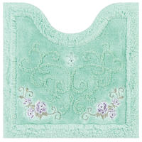 光沢感のあるアクリル糸を使用。ヨーロッパ調の装飾オーナメント柄を地柄で立体的に表現。バラの刺しゅうにはラインストーンを取り付け華やかにしました。上品でエレガントなトイレマットです。