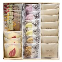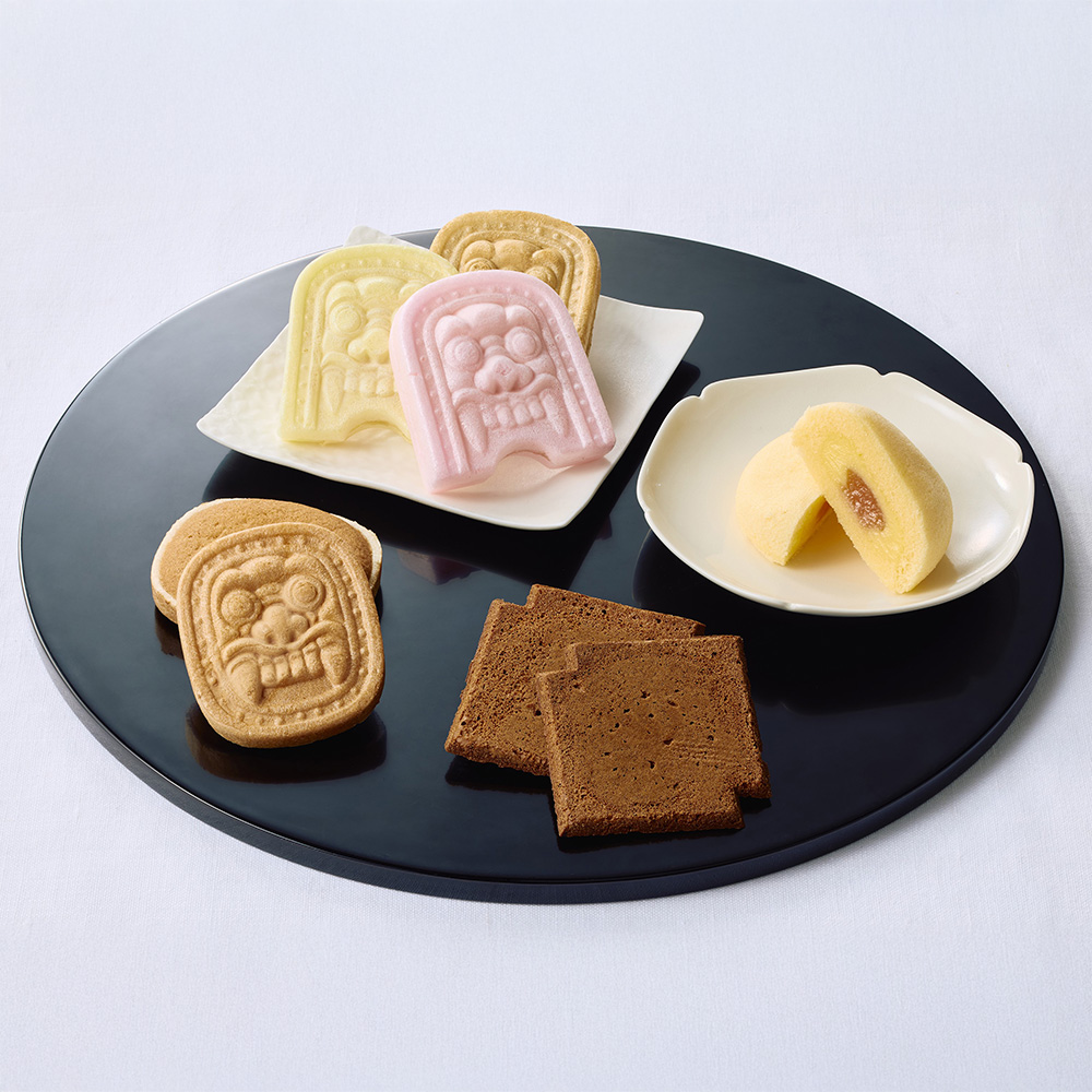 ふわふわなパンケーキ生地でクリームを包み込み、クリームの中には酸味を効かせた濃厚な苺ジャムを入れた人気商品「鬼姫のしずく」と、定番商品「鬼サブレ」「瓦せんべい」を詰めた虎屋本店の人気セレクション商品です。