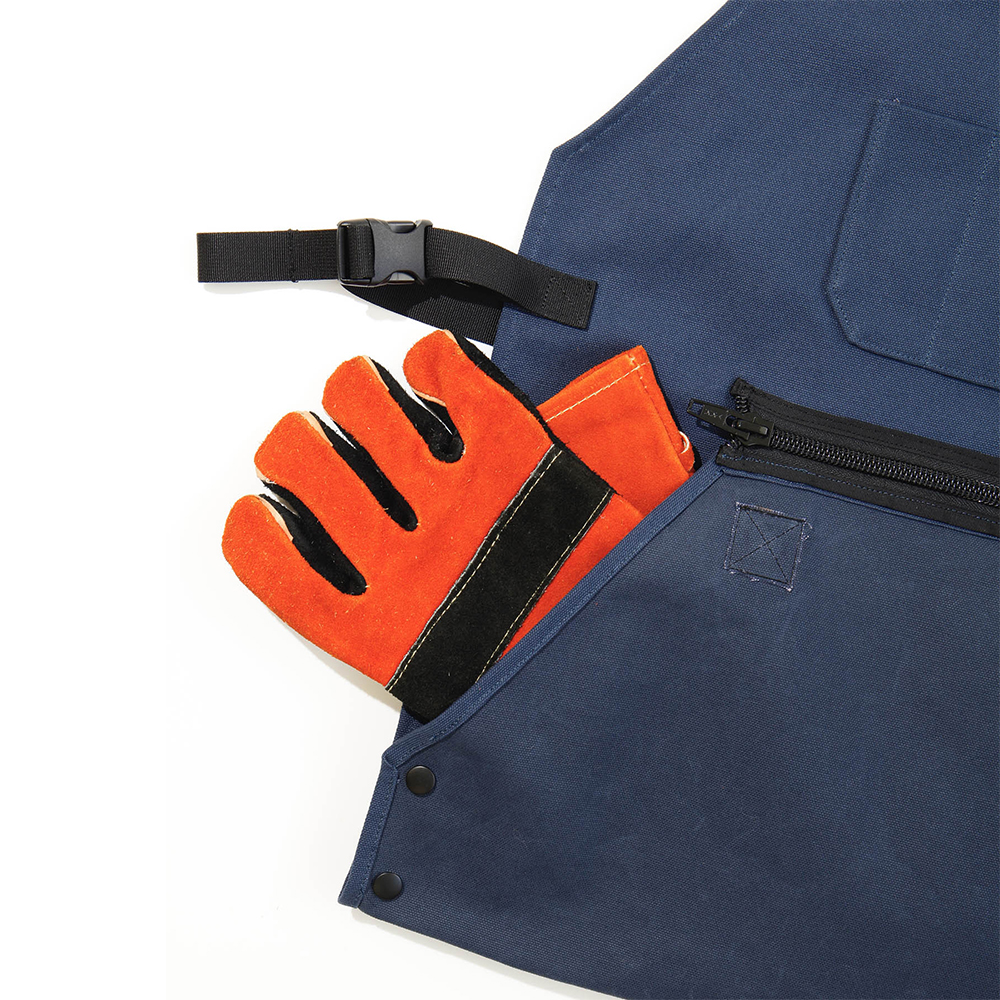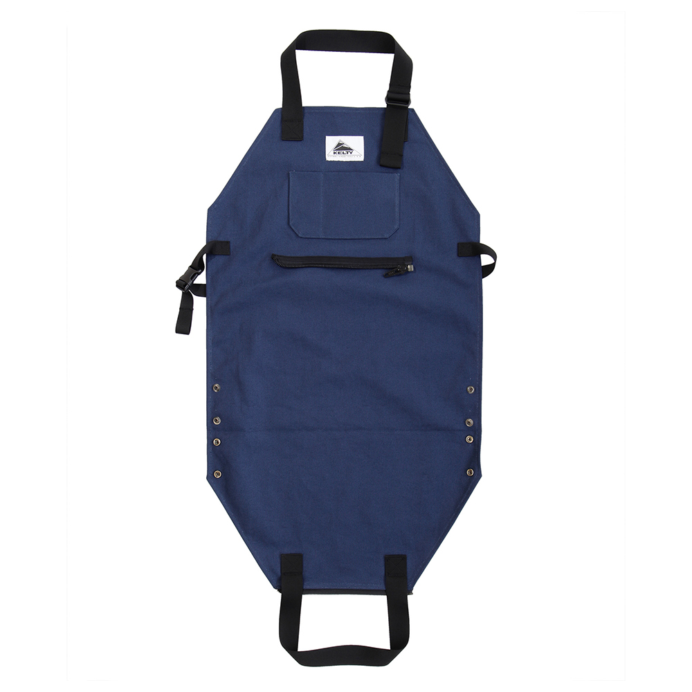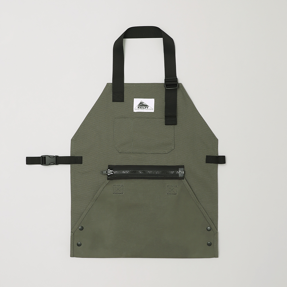 エプロンにバッグの機能がついた便利なアイテム。おなかのファスナーを外し、広げると、荷物を巻いて運べるバッグに変身します。エプロン時には折れた下部は、ポケットとして使用いただけます。
