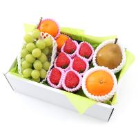 シャインマスカット(350g)(長野県・福島県産他)×1房、紅まどんな(200g)(愛媛県産)、いちご(15g)(栃木県・福岡県・静岡県産他)×6粒、西洋梨(200g)(山形県・新潟県・福島県産他)×1、みかん(60g)(神奈川県・長崎県・愛媛県産)×3