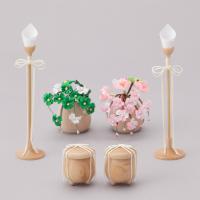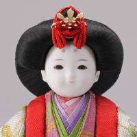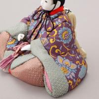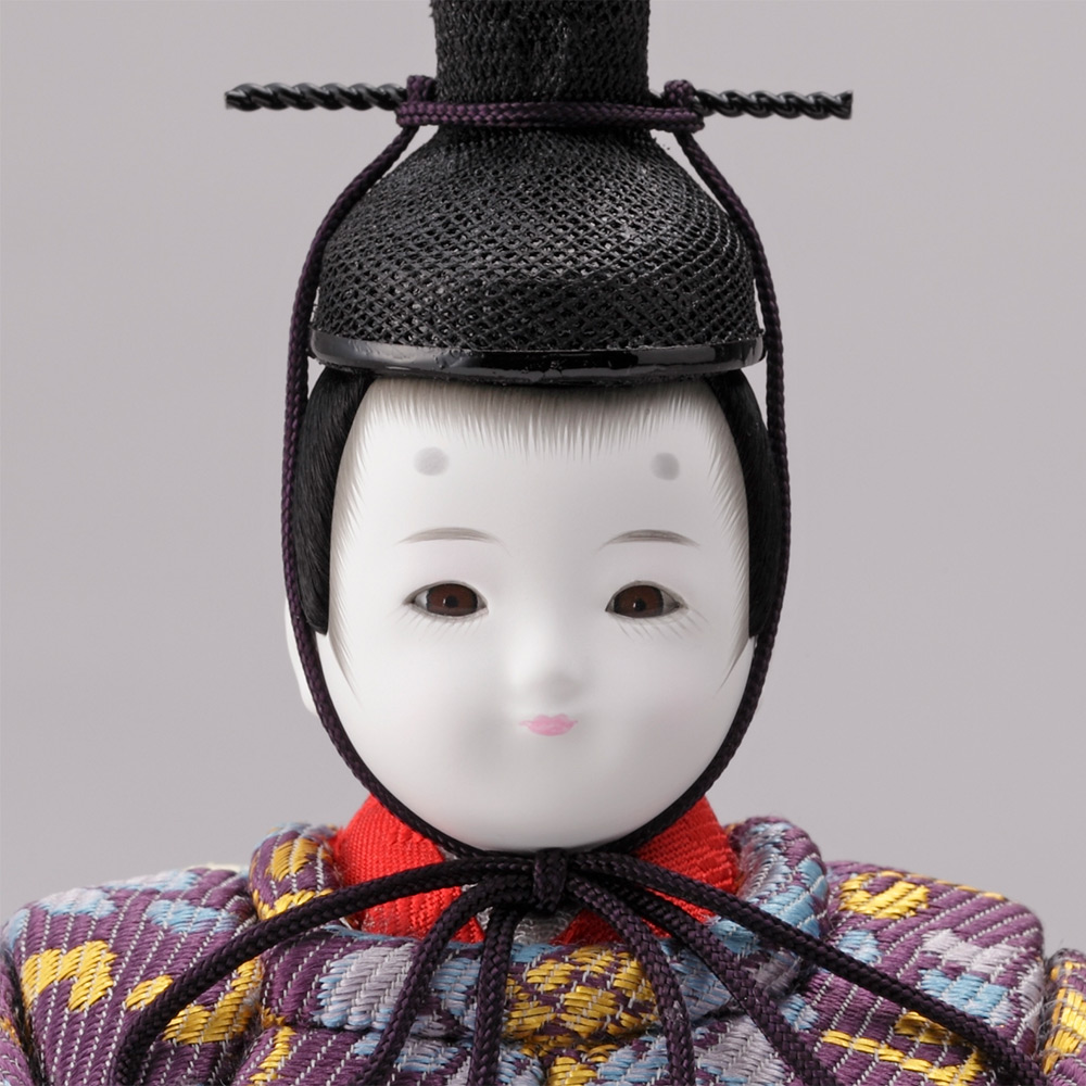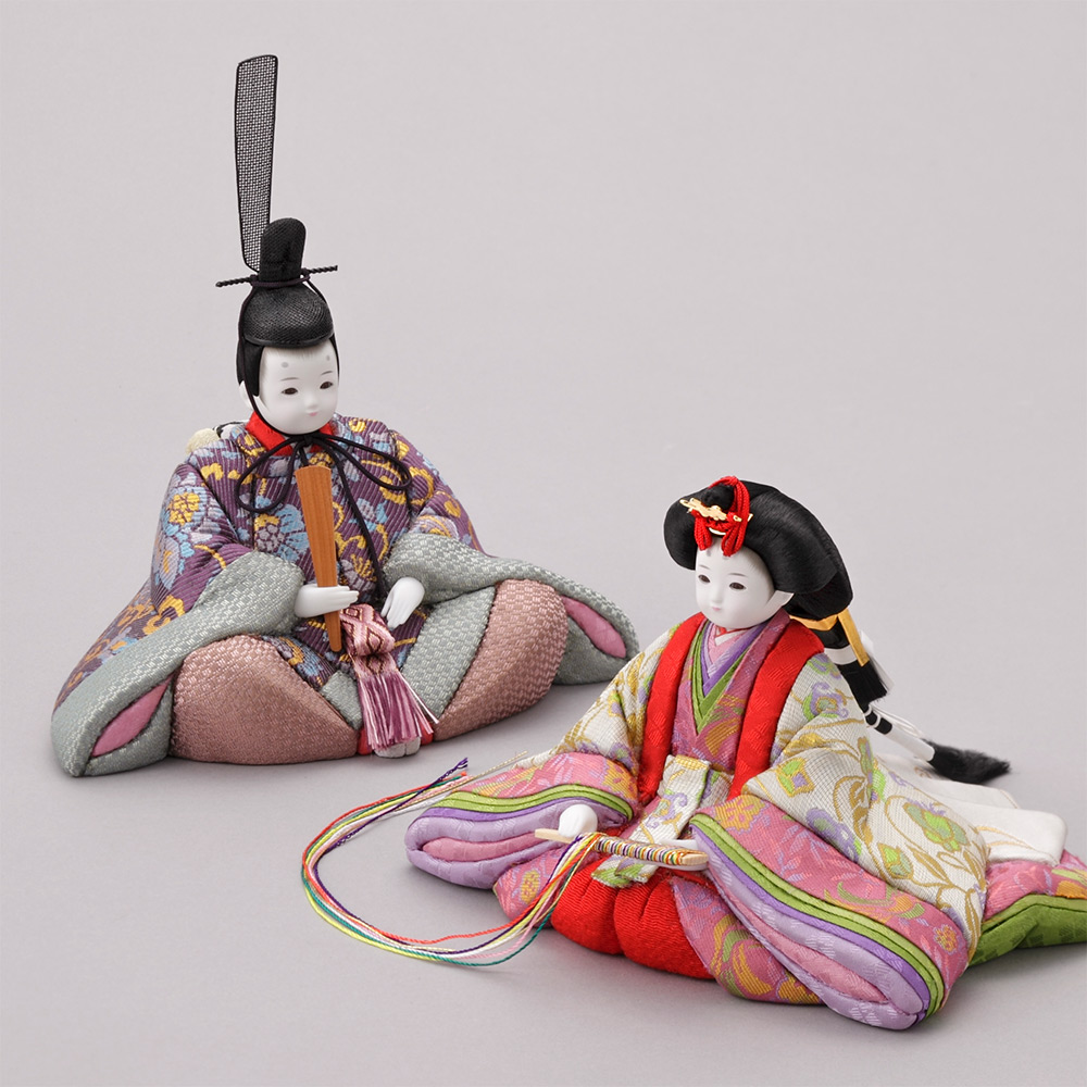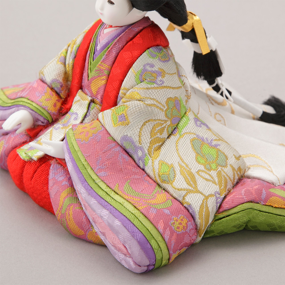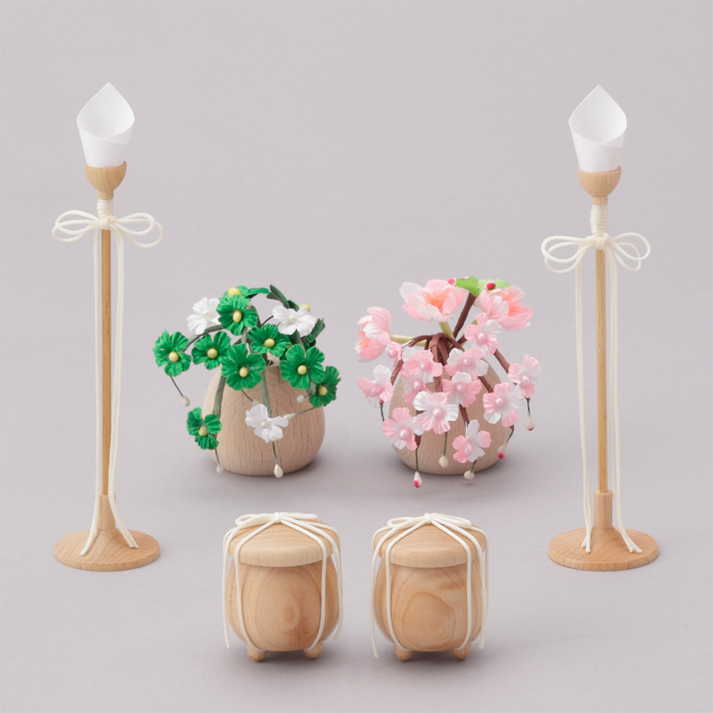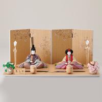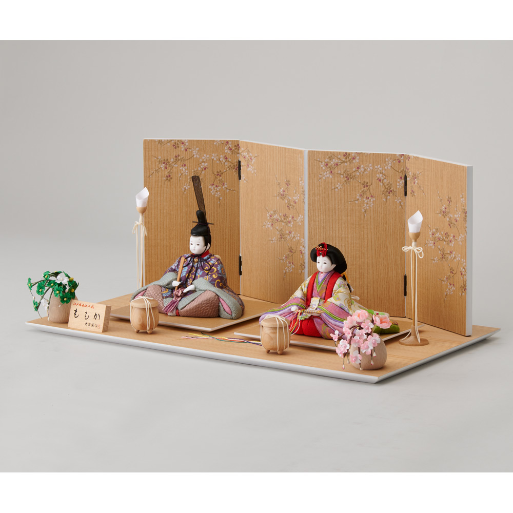 愛らしい木目込みのおひな様。リビングルームにもマッチする、木目調の屏風やお道具とともに。