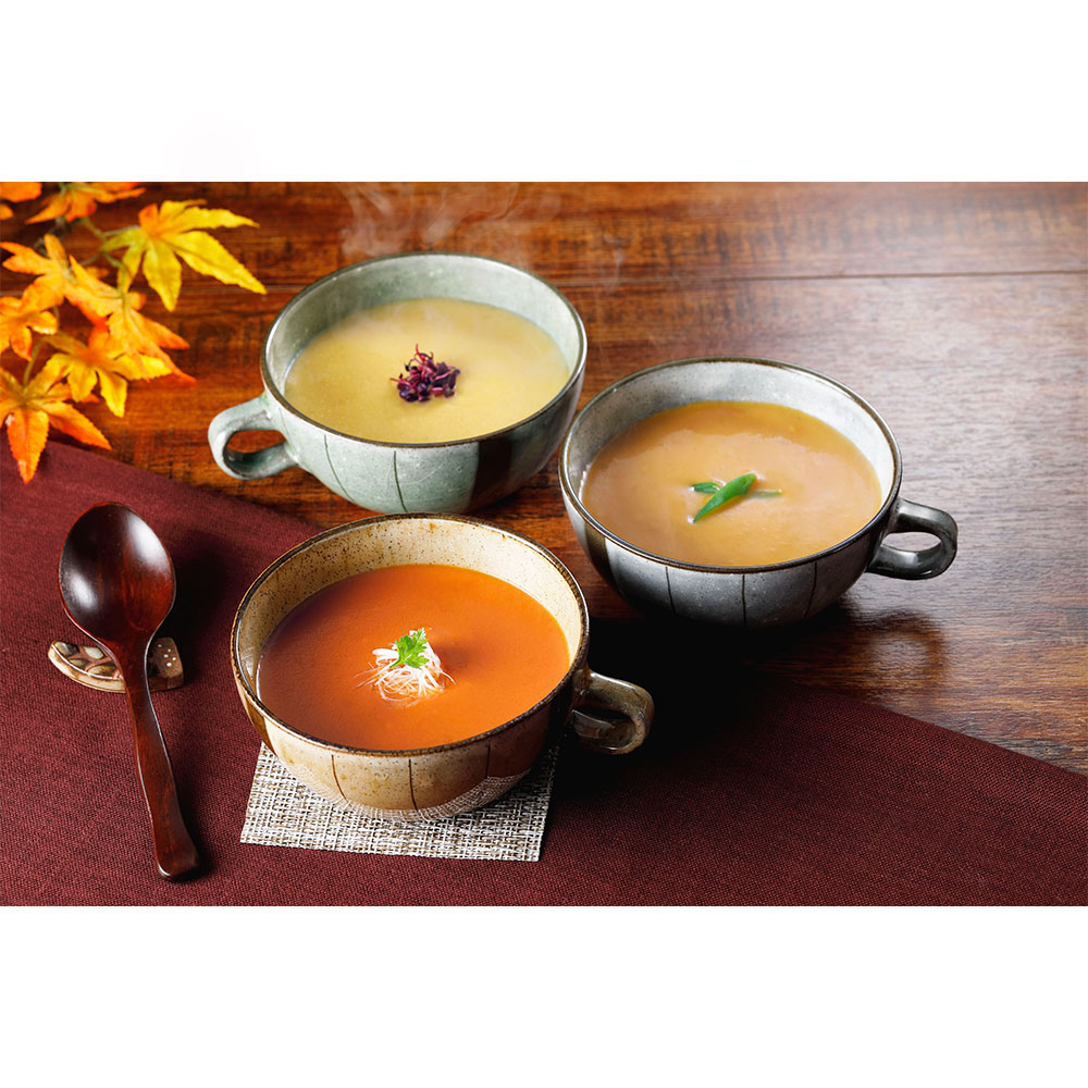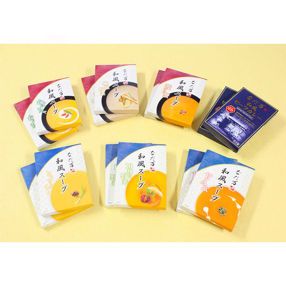 なだ万の味をご家庭でお楽しみいただける詰め合わせをご用意しました。後引くスパイスの香りと和の旨みが織りなす絶妙な味わいのビーフカレーと、じゃがいもをすり潰し昆布や鰹の旨みを加えたポタージュ仕立ての和風スープ6種を、それぞれ2箱ずつ詰め合わせました。和風スープは、冷やしても温めても美味しく召し上がっていただけます。