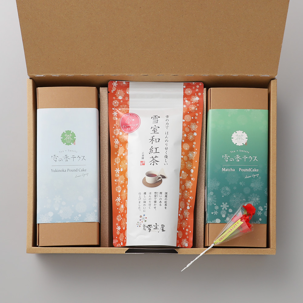 雪の香パウンドケーキ(プレーン・雪室抹茶 各1)、雪室和紅茶ティーバッグ(2g×10P)、カーネーション造花×1本