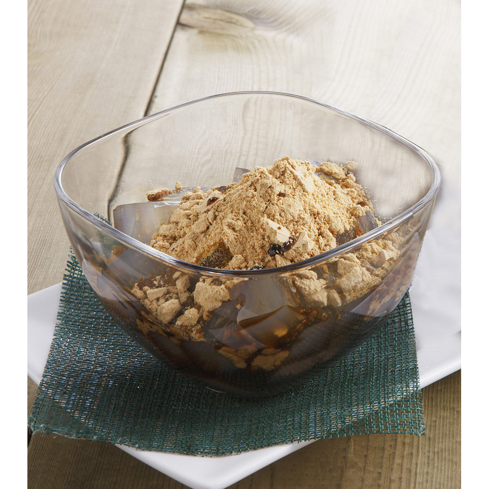 国内産の天草を直接煮出して作った寒天に沖縄産黒砂糖で作った黒蜜・国産大豆きな粉を添えた和風デザートです。甘さ控えめで、うま味とコクのある味に仕上げました。